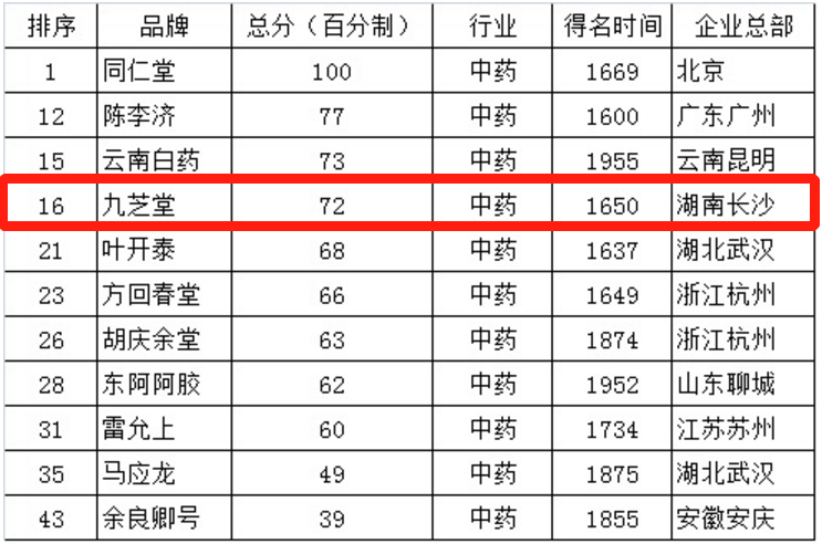 有11個中藥品牌上榜,以榜單第一名350多歲的同仁堂為首,還包含陳李濟、云南白藥、九芝堂等。