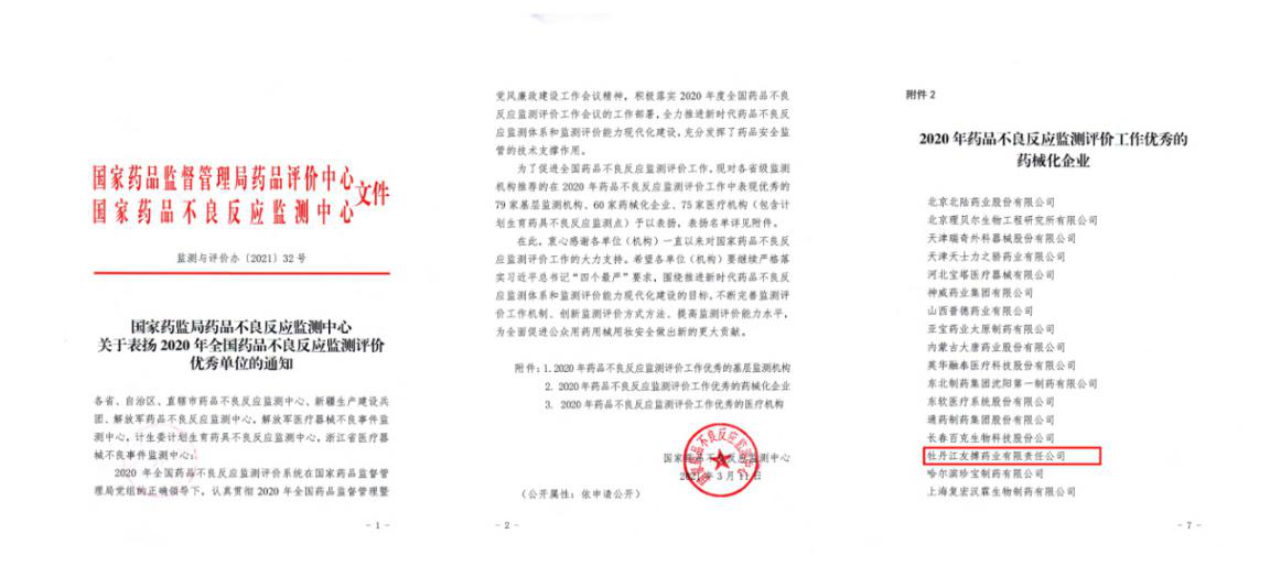 《中華人民共和國國民經(jīng)濟和社會發(fā)展第十四個五年規(guī)劃和2035年遠景目標(biāo)綱要》中提出,強化中藥質(zhì)量監(jiān)管,促進中藥質(zhì)量提升。為促進全國藥品不良反應(yīng)監(jiān)測評價工作,2021年3月12日,國家藥品監(jiān)督管理局藥品評價中心辦公室印發(fā)了《國家藥監(jiān)局藥品不良反應(yīng)監(jiān)測中心關(guān)于表揚2020年全國藥品不良反應(yīng)監(jiān)測評價優(yōu)秀單位的通知》,九芝堂子公司牡丹江友搏藥業(yè)有限責(zé)任公司作為黑龍江省監(jiān)測機構(gòu)推薦企業(yè),榮獲了“2020年藥品不良反應(yīng)監(jiān)測評價工作優(yōu)秀的藥械化企業(yè)”稱號。