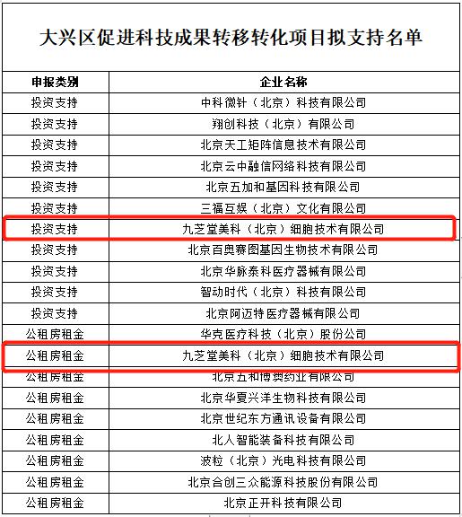 2021年02月25日,九芝堂美科獲得大興區促進科技成果轉移轉化項目投資支持和公租房租金兩項資助。