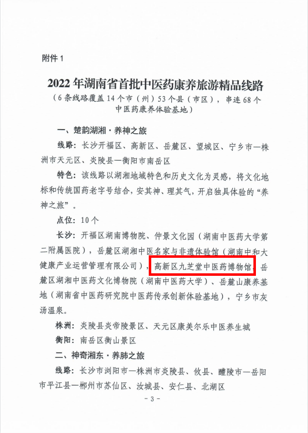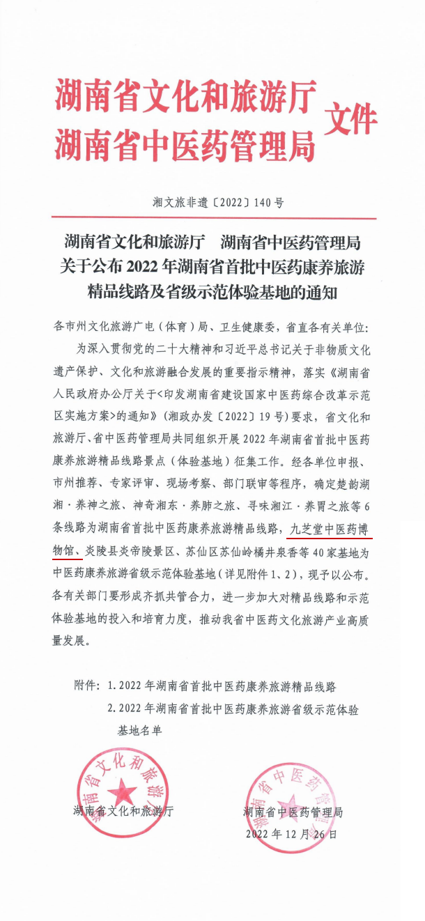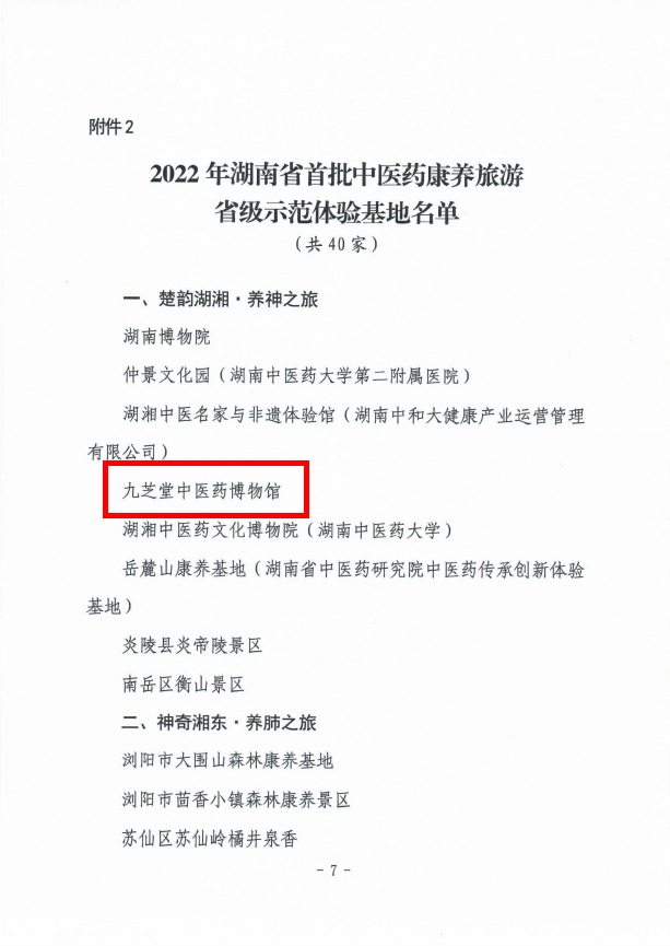 2022年12月26日,湖南省文化和旅游廳、湖南省中醫藥管理局聯合發布《關于公布2022年湖南省首批中醫藥康養旅游精品路線及省級示范體驗基地的通知》,九芝堂中醫藥博物館被評為中醫藥康養旅游省級示范體驗基地。