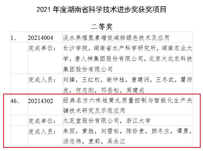 2023年2月24日,湖南省科技創新獎勵大會在長沙召開,大會公布和表彰了2021年度湖南省科學技術獎獲獎項目。省委副書記、省長毛偉明出席并為獲獎代表頒獎。經省科學技術獎勵評審委員會評審,省科學技術獎勵委員會審定,省人民政府批準,九芝堂的“經典名方六味地黃丸質量控制與智能化生產關鍵技術研究及示范應用”項目被授予湖南省科學技術進步獎二等獎。在本次獲獎項目中,以生物醫藥企業為第一完成單位的僅2項,其中九芝堂是唯一一家以第一完成單位獲獎的中藥企業。