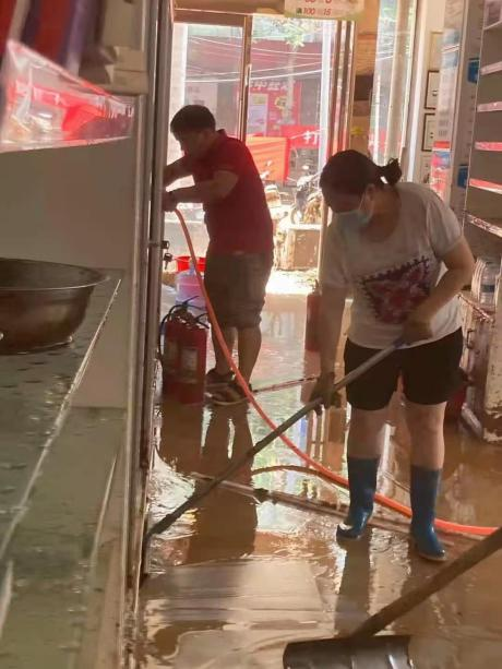 幫助客戶脫險復業,哪里需要,我們就卷起袖子一起干。洛陽焦作地區,地區經理帶領業務員幫助泡水藥店打掃淤泥,恢復經營。